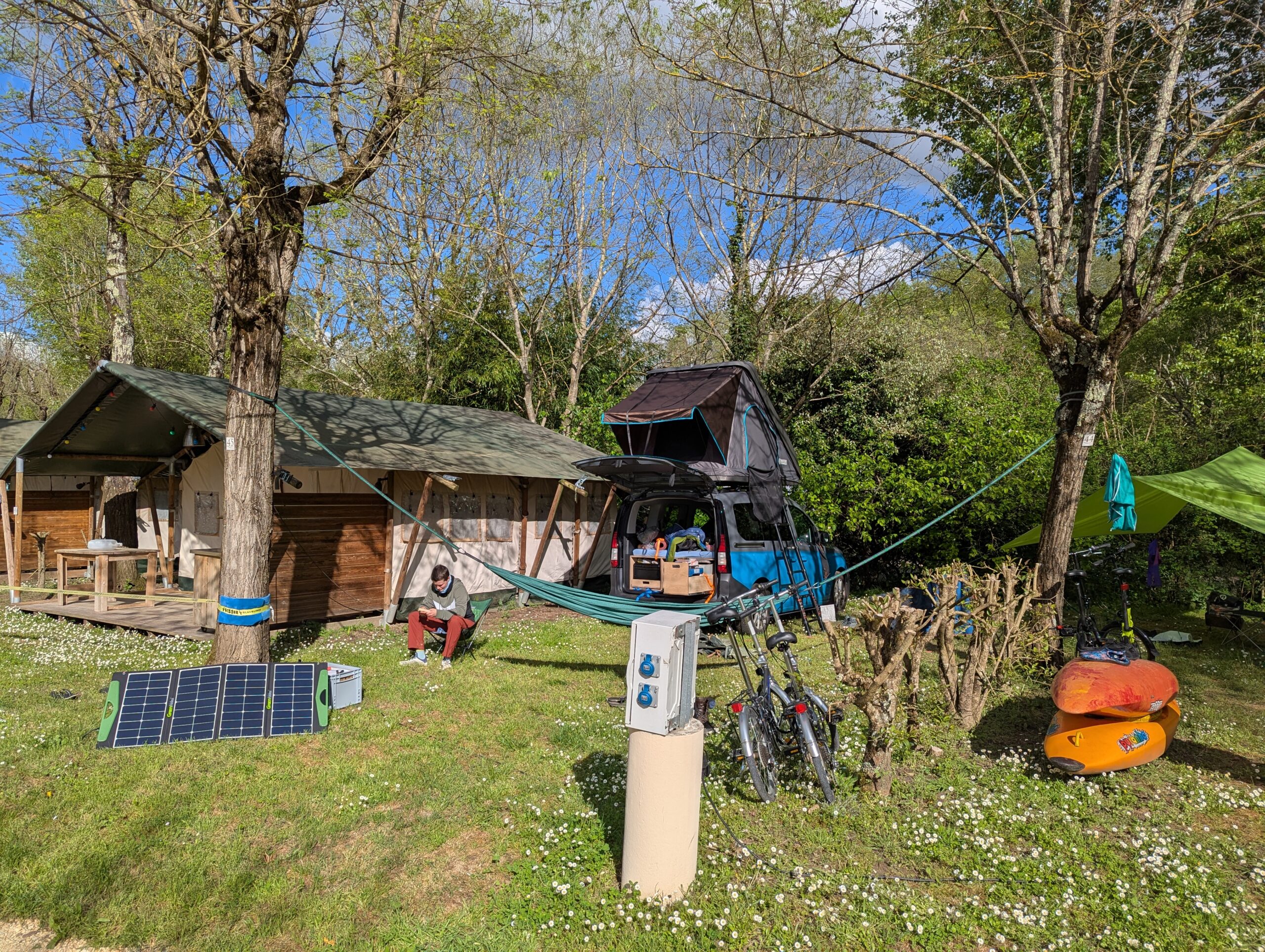 Neu bei uns eingezogen ist eine Slackline und ein kleines Solarpanel mit einer kleinen Batterie, was der Kühlbox die Notwendige Energie spenden und uns vor Stromkosten bewahren soll. Und solange Ylvas Eltern da sind wird unser Hobby Arsenal um Paddeln erweitert.