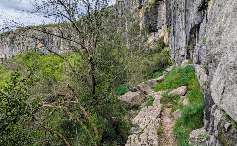 Eine wundwerschöne Kletterwand in Laufnähe zum Campingplatz ist der Cirque des Gens, wo ein langer Flussbogen vollständig von einer langen Steilwand umgeben ist.