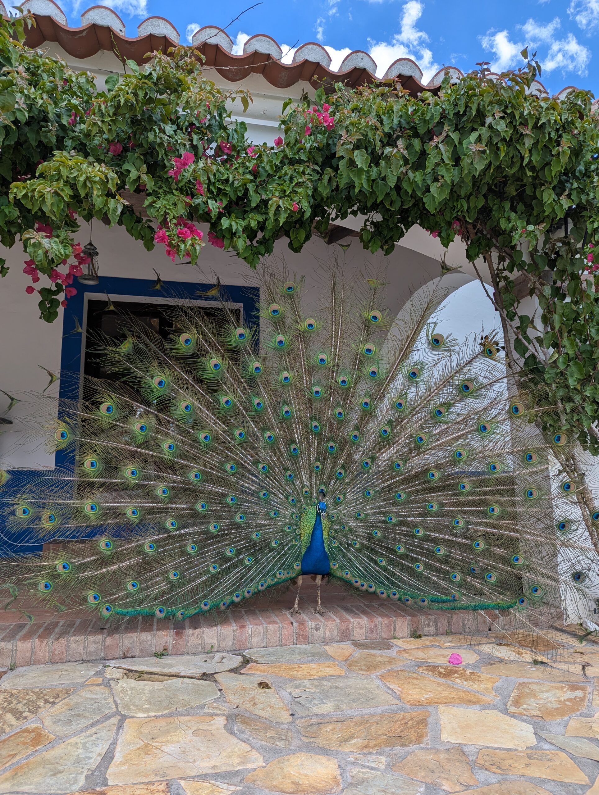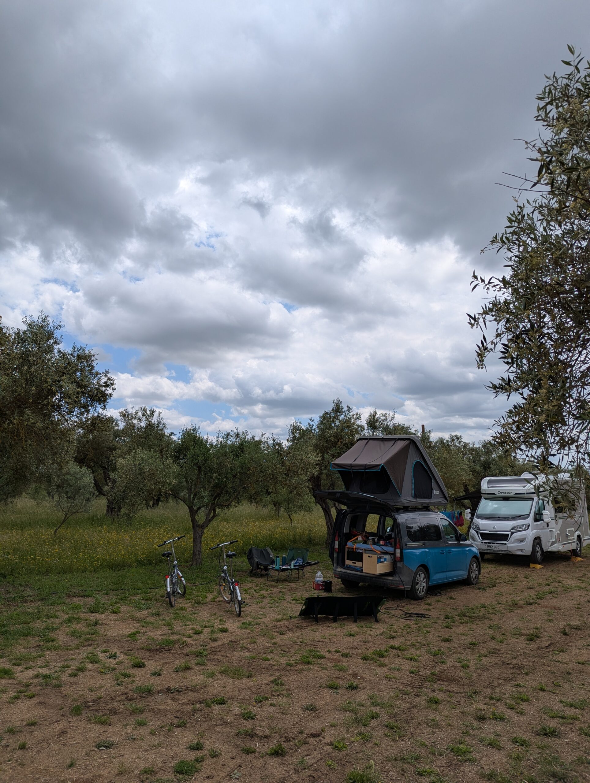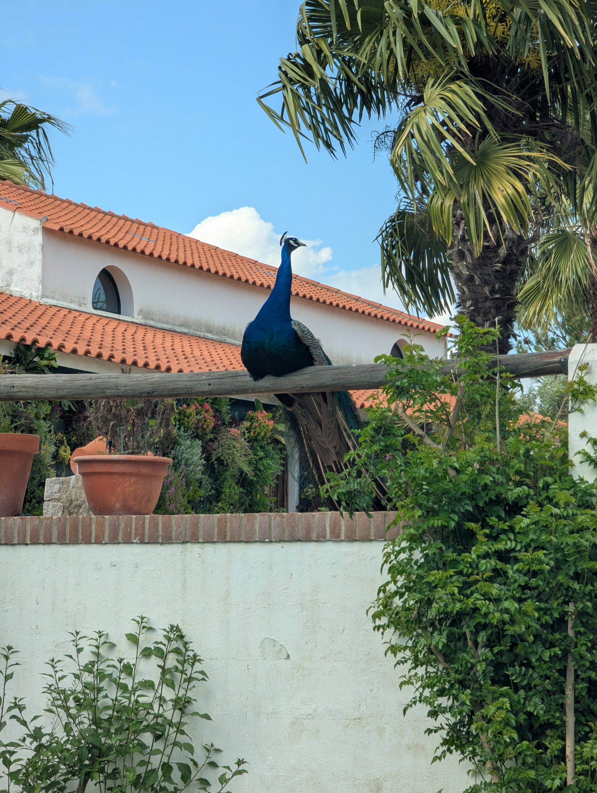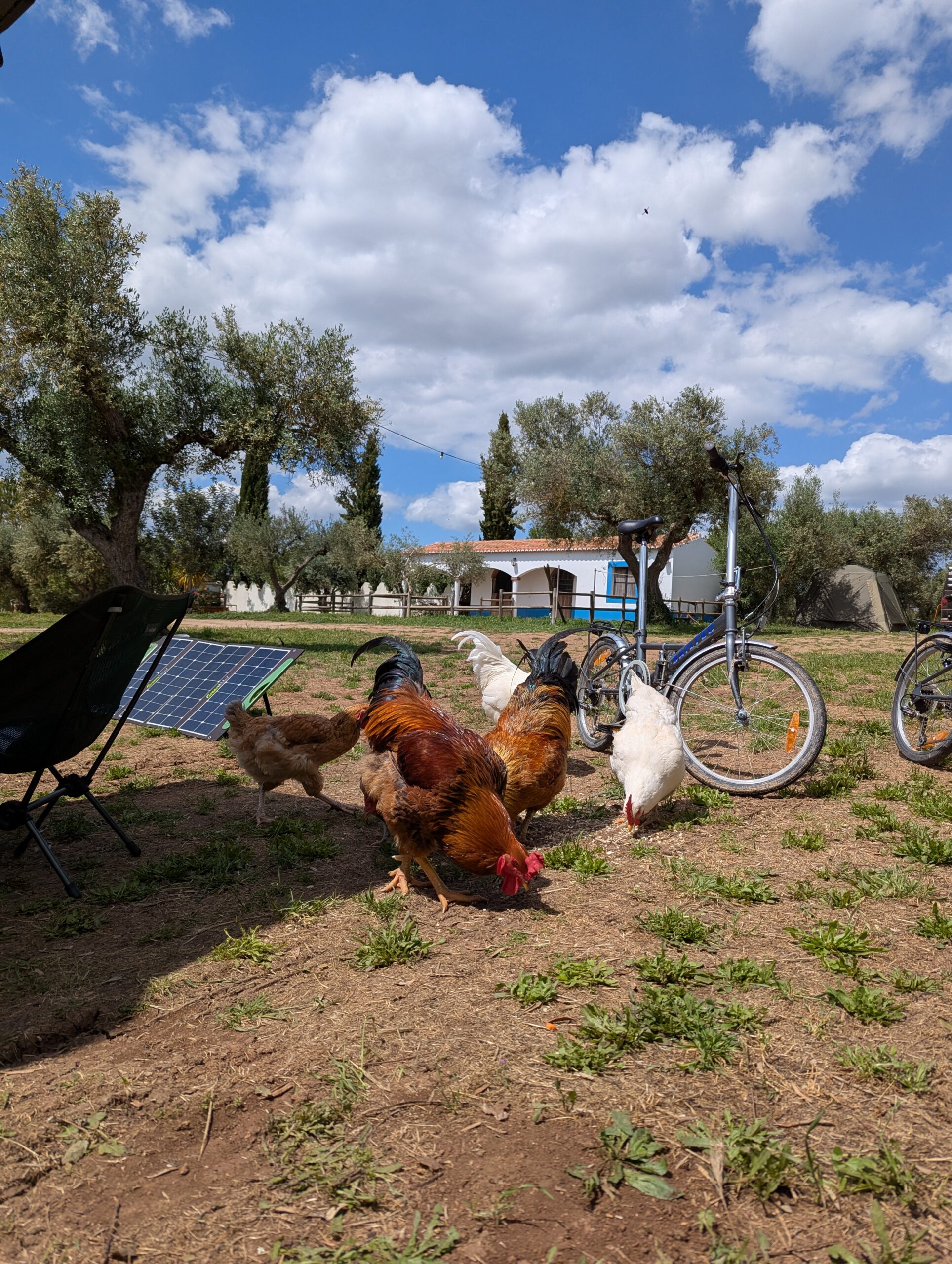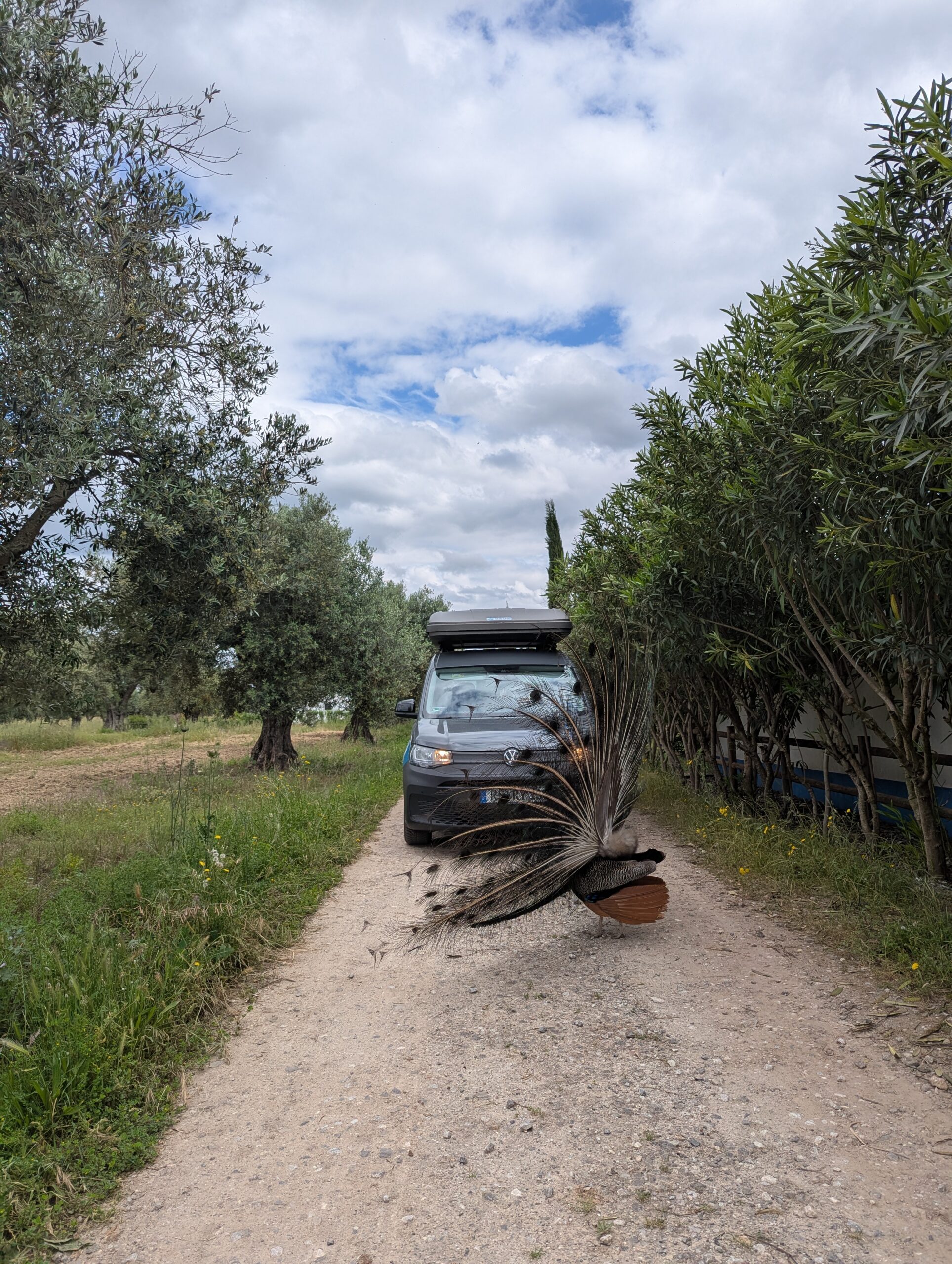 Als ersten Stop in Portugal haben wir uns für einen Vansite Platz im südlichen Inland entschieden. Bereits vor dem Platz „Monte das Louzeiras“ wurden wir von einer Gruppe bunter Pfauen begrüßt. Der Platz war liebevoll eingerichtet mit einem großen Aufenthaltsraum plus kleinem Laden in dem der Besitzer (Mark, ein Schweizer) selbst angebauten Wein und Olivenöl verkauft. In einem Olivenhain haben wir unser Lager aufgeschlagen und wurden sofort von jede Menge Katzen und Hühner belagert, die interessiert unser Abendessen beäugt haben.